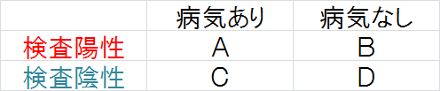 ”感度”とは、真性陽性になる確率:下表のA/(A+C)になります