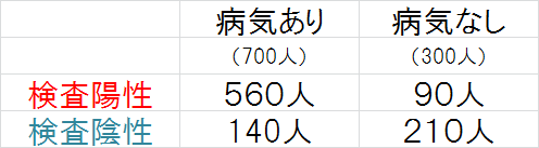 母集団を1000人と想定して、罹患割合と検査結果の表を作成すると、下記になります。